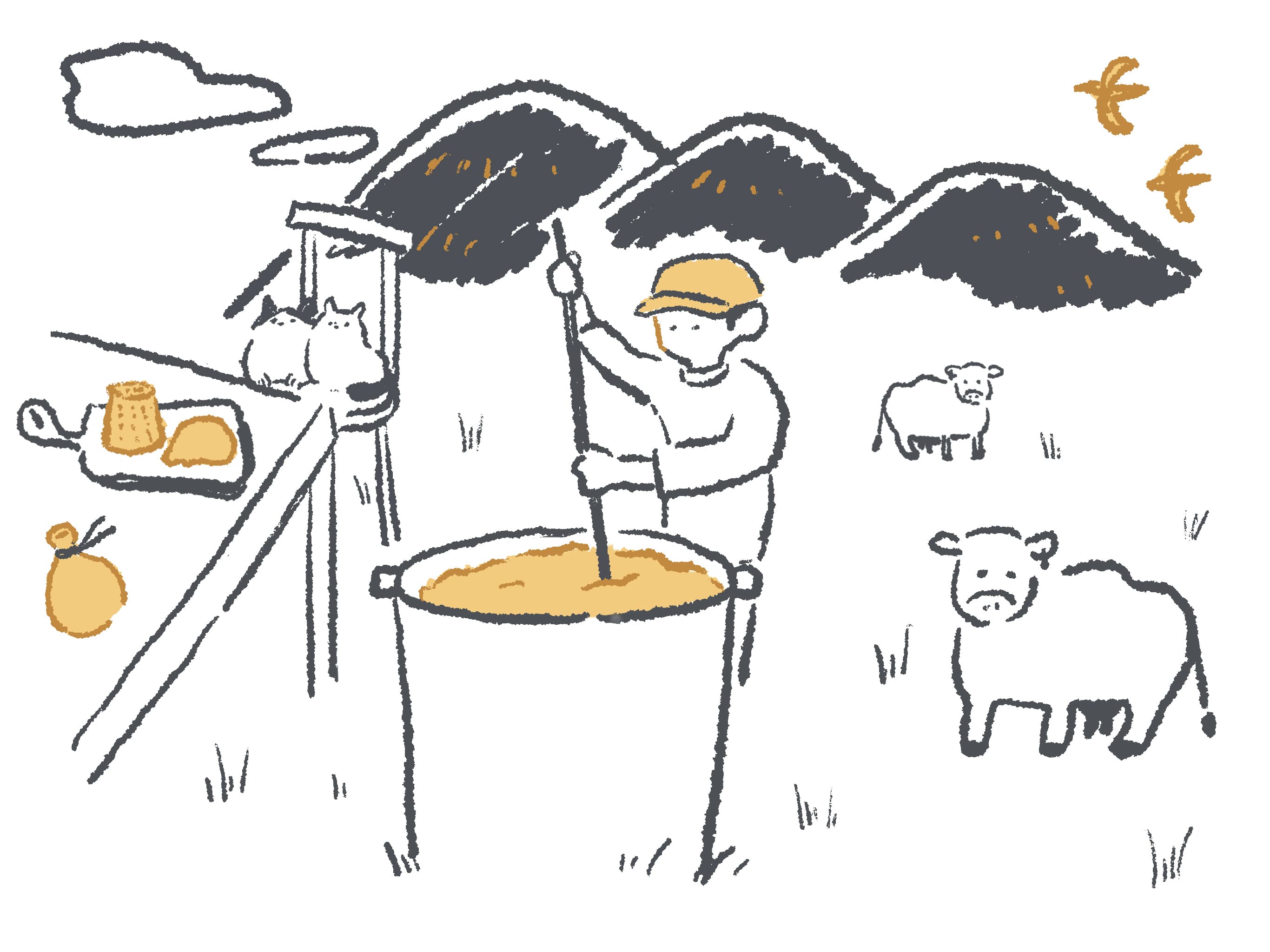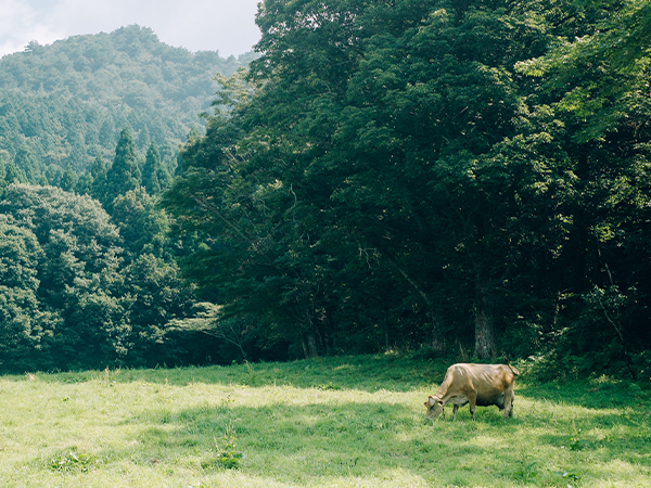 産乳量が少なく高価だけれどその分濃厚でクリーミーな味わいのジャージー牛ミルク。この濃厚さはフレッシュなチーズ作りにピッタリ。複雑な味わいの美味をうみだします。夏期は牧草を食み動き回るやんちゃな牛たち。冬は夏のうち酪農家さんたちが作り貯めた発酵した草を食べています。ミルクは自然が育んだ草から生まれるのです。とても繊細だけれど飲み比べるとわかる季節ごとに変化するミルクの風味。蒜山の自然のテロワール。この風味を壊さぬよう気を付けてつくりあげます。